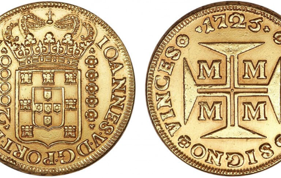O dobrão de 20 mil réis é uma das primeiras moedas cunhadas no Brasil, tendo circulado até a época da proclamação da República. O lote foi emitido ente os anos 1724 e 1727, na Casa da Moeda de Vila Rica, em Minas Gerais.