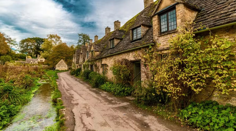 As casas de Arlington Row, em Bibury, são o principal cartão-postal da vila e datam do século XIV. Construídas em pedra dourada, foram transformadas em moradias de tecelões no século XVII e hoje figuram entre as casas mais fotografadas do Reino Unido, estampando inclusive as notas de £20 do Banco da Inglaterra.
