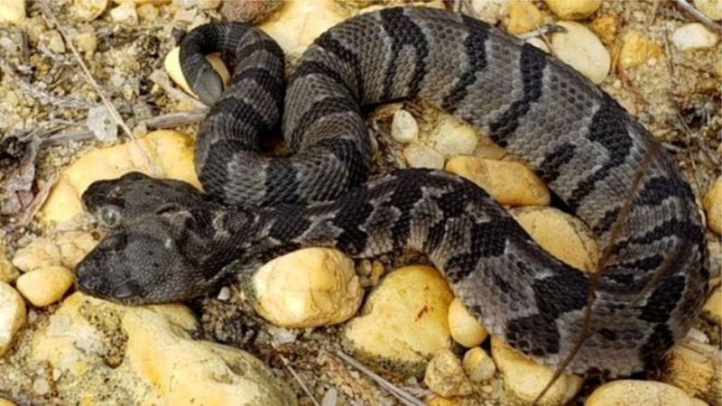 Uma rara cascavel de duas cabeças foi encontrada em uma floresta no Estado americano de Nova Jersey.