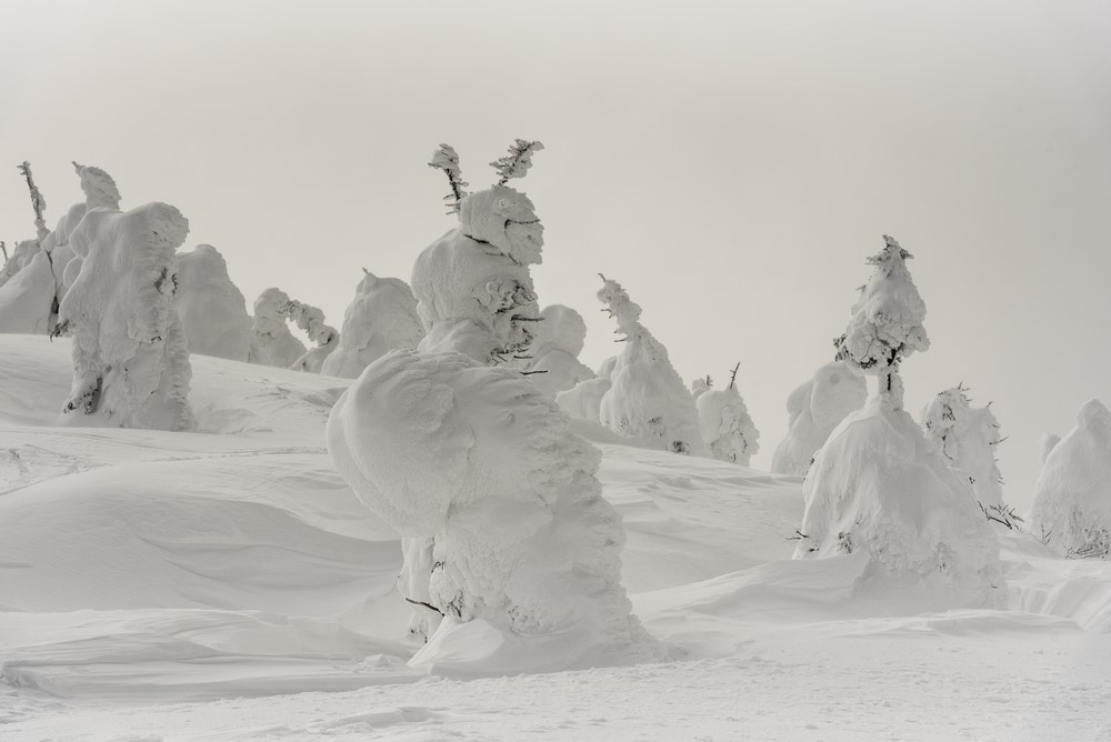 Segundo Kaushik, os Monstros de Neve se formam quando as gotículas de água presente no ar congelam no inverno e vão se acumulando nos galhos dos pinheiros que se espalham pelo Monte Zao. No entanto, por conta da força dos ventos que sopram na região, as gotinhas formam uma porção de pingentes de gelo que ficam praticamente na horizontal, e quando a neve começa a cair, ela cobre as árvores, criando essa monstruosa paisagem. Confira mais uma imagem: