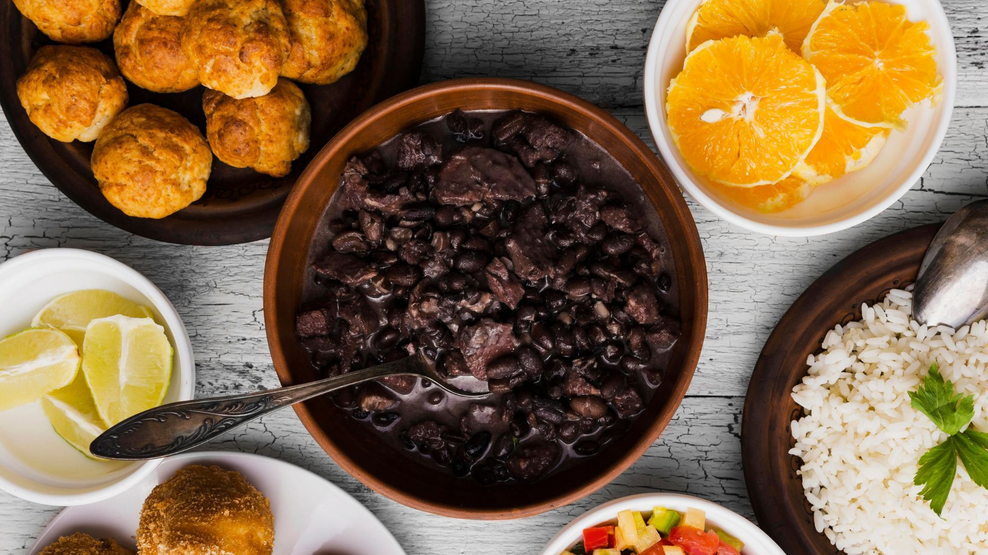 Feijoada é de longe uma das comidas brasileira mais conhecida. Feita com feijão preto cozido, com carne seca, linguiça, paio, torresmo e temperos. É considerado o prato nacional do Brasil e é tradicionalmente servido com arroz branco, e uma farofa. Eita, deu água na boca, ein?