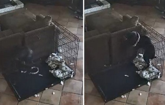 Após alguns segundos latindo, os animais se calam. Um dos cães, no centro da imagem começou a ganir e foi parar no fundo da gaiola. É exatamente nessa hora que a coleira se afrouxou e caiu sobre o chão.
