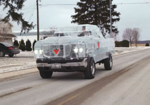 Com o objetivo de entrar para o Guinness, uma empresa canadense contratou uma equipe de escultores e construiu uma picape de gelo. Foram usadas cinco toneladas de gelo para montar o corpo da caminhonete.