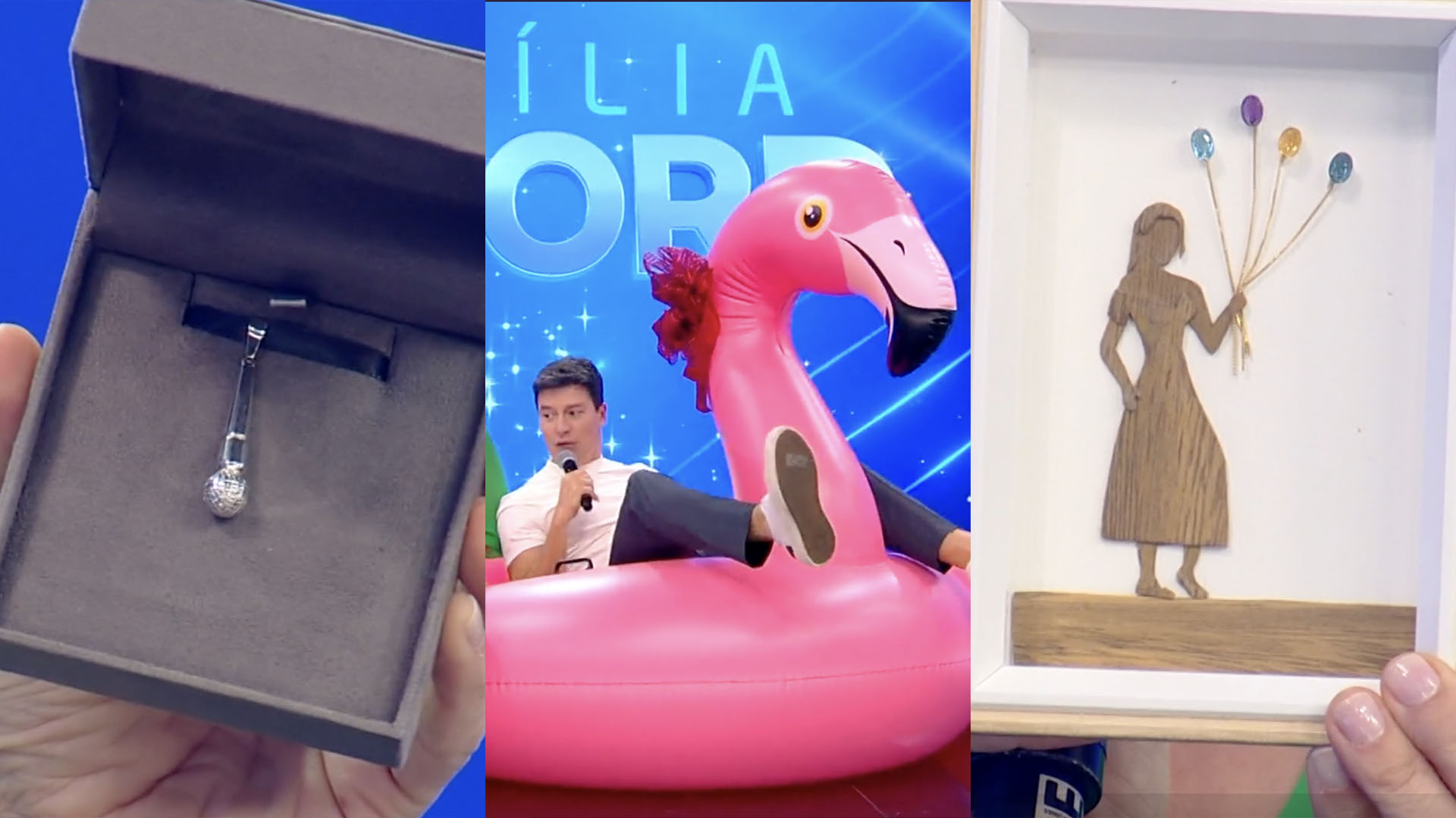 Rapidamente, o apresentador se deparou com uma boia gigante de flamingo e até tirou o paletó para poder testá-la. "Rapaz! Gente, eu amei o presente, a pergunta é: como é que eu vou levar esse flamingo pra casa?", questionou. "Se você levar murcho, eu quero ver você encher isso aí no fôlego!", desafiou Mariana. Faro mostrou entusiasmo com o presente, mas também recebeu mais dois mimos da colega: um pingente de microfone em ouro branco e um quadro com pedrinhas.