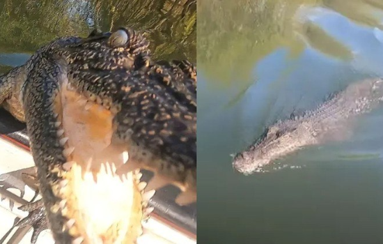 Uma dupla de pescadores levou mais susto ao ser atacada por predadores da Austrália. O motivo foi um crocodilo faminto e sorrateiro que surgiu na água e tentou subir no barco.