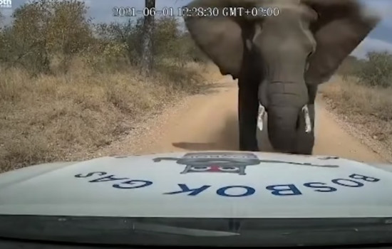Em imagens impressionantes, um elefante mostrou toda a sua força ao esmagar o capô de uma picape com a tromba e as presas, além de empurrá-la por alguns metros. Detalhe: o motorista estava dentro do veículo e passou por momentos de pânico.