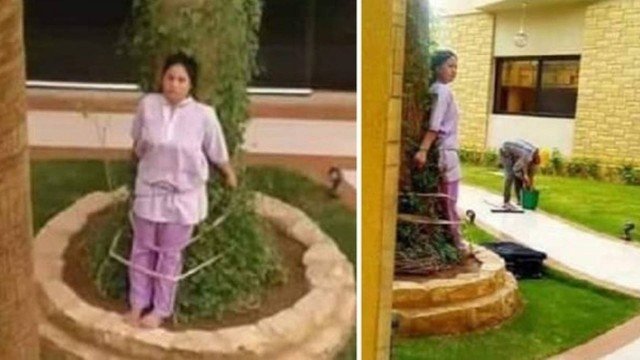 Uma empregada filipina foi amarrada a uma árvore no quintal de uma casa em Riad (Arábia Saudita) como punição aplicada pelos patrões sauditas. O "pecado" cometido por Lovely Acosta Baruelo, de 26 anos, foi ter deixado do lado de fora da casa um móvel caro. A ideia era mostrar à filipina o que o sol é capaz de fazer ao que é exposto a ele. A punição foi registrada por outra filipina que trabalha como empregada no mesmo condomínio de luxo, de acordo com o "Metro". Lovely não trabalha mais na casa. O caso foi denunciado na semana passada pela embaixada das Filipinas em Riad e a empregada foi expulsa da Arábia Saudita no dia seguinte.
