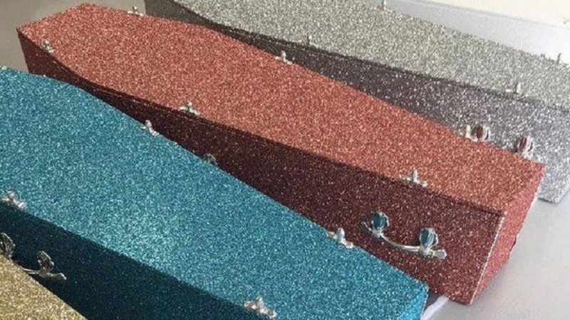 Se a opção for a cremação, a Glitter Coffin Company não vai perder o cliente. Estão à venda pequenas urnas para cinzas. Com muito, muito brilho. Versões para animais de estimação também estão disponíveis. A companhia envia os produtos fúnebres purpurinados para vários países.