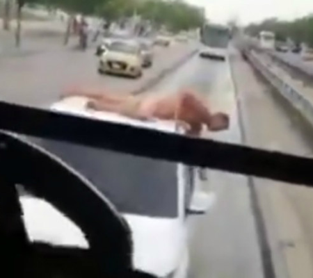 Conforme reportado pelo jornal argentino Crónica, essa é a versão compartilhada entre internautas para explicar a cena bizarra acima, registrada recentemente em Barranquilla, na Colômbia. Independente da versão, o fato é que diversas pessoas testemunharam um cara pelado no teto de um carro.