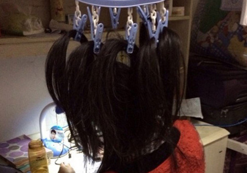 Chinesa amarra os cabelo com pregadores para evitar dormir | Foto: Reprodução/Internet