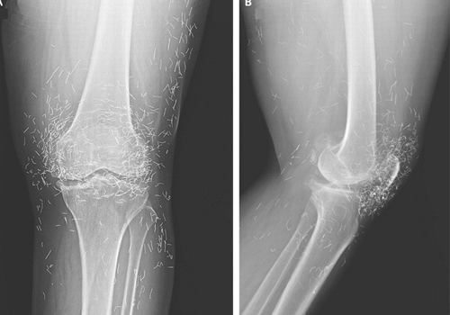 Uma radiografia divulgada pela instituição mostrou o joelho da sul-coreana cercado de diversos fragmentos de agulhas.