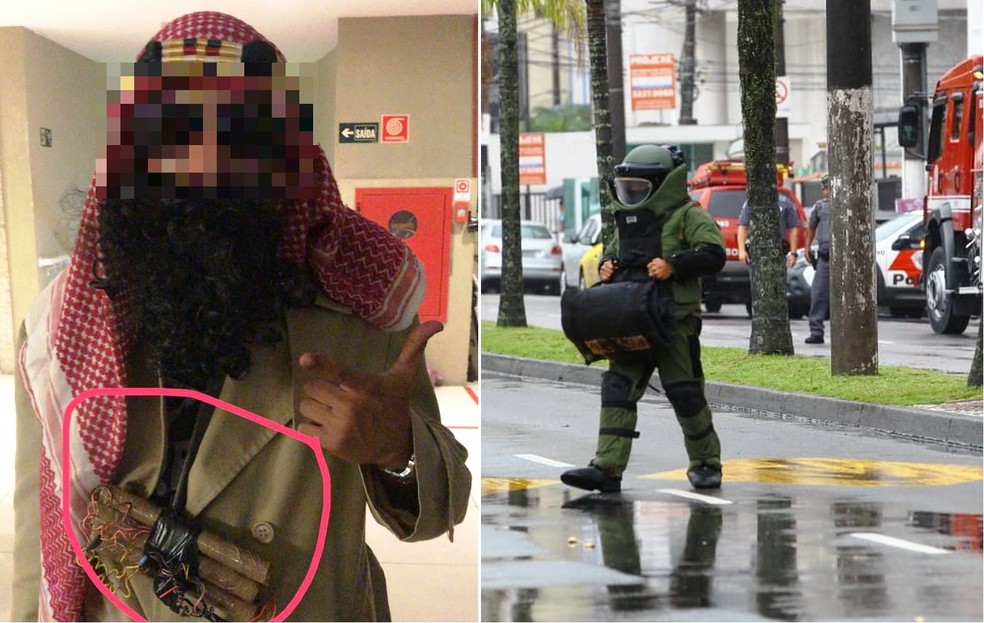 Ele estava com os colegas do trabalho em uma festa temática da empresa. "Quando vi que seria à fantasia, pensei em algo que pudesse ter em casa. Montei um turbante, peguei um sobretudo e fiz aquela 'bomba' com cabo de vassoura para simular dinamite, fita adesiva, fios velhos e um painel de moto velho. Pode ter parecido real", explica.