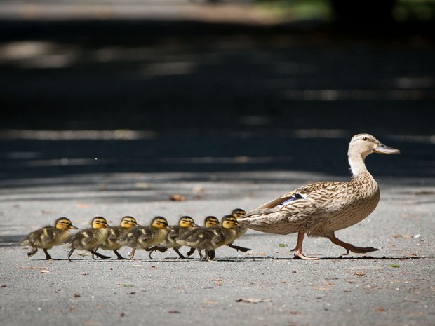 Família de patos foi clicada atravessando calçada em fila 'comportada' em Offenbach, na Alemanha. Veja imagem ao lado.