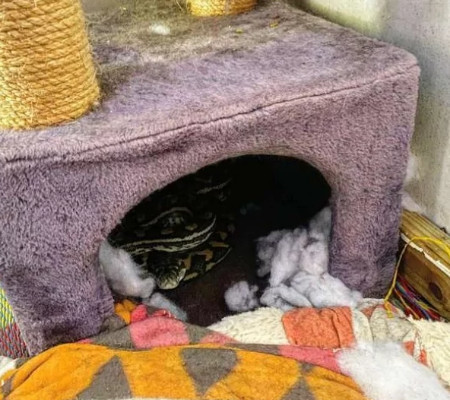 Família encontra cobra píton escondida na casa do gato e se apavora