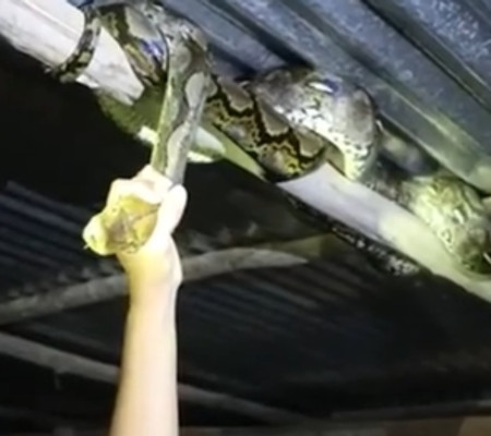 Uma enorme píton foi encontrada no teto de um galinheiro em Ang Thong, na Tailândia, enquanto caçava de noite para comer. O animal tinha quatro metros e causou pânico na moradia.
