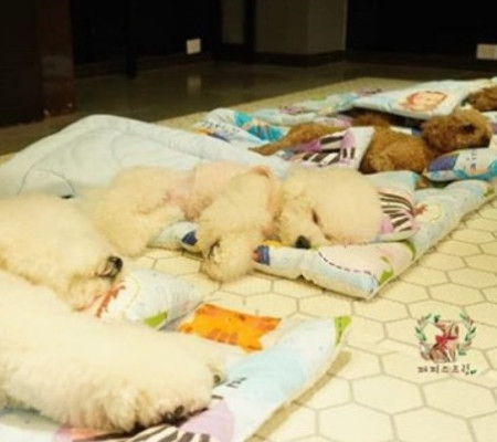 A creche Puppies’ Spring fica em Gyeonggi-do, na Coreia do Sul, mas com as fotos dos filhotes conquistou fãs do mundo todo. Os registros que mais chamam atenção são os dos cães dormindo juntos - cada um na sua caminha, cobertos com uma manta.