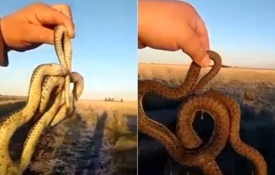 "Olha se não está frio", relata o homem que segura o animal durante a gravação, "até as víboras congelaram aqui."