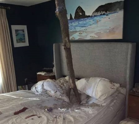 Uma mulher foi resgatada depois que uma parte de uma árvore caiu, atravessando o teto da casa e ficando espetada na cama entre ela e o seu marido enquanto eles dormiam, em Spokane (estado de Washington, EUA), no início da manhã de quarta-feira (13/1), quando a região era atingida por fortes ventos. Com informações do Extra.