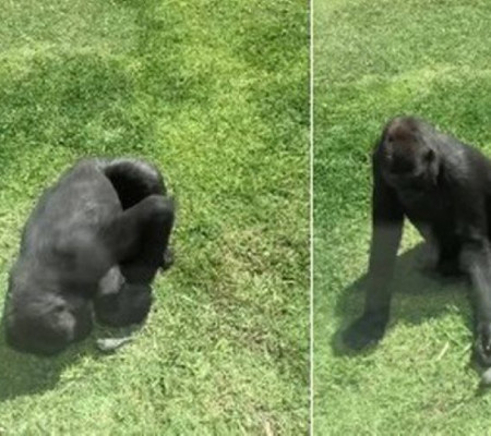 O gorila então se deita para examinar o pobre pássaro antes de se levantar novamente e pegá-lo delicadamente com a mão esquerda. O símio rapidamente solta o pássaro quando ele tenta bater suas asas, mas rapidamente aborta a tentativa, e o gorila mais uma vez o segura em suas mãos.