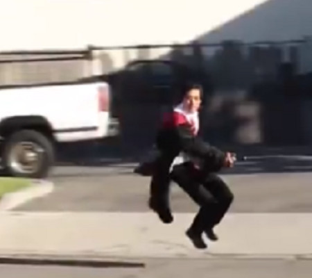 Na verdade, se trata apenas de uma ilusão de ótica feita com um espelho e uma perna postiça. No final do clipe de apenas 18 segundos, podemos ver que a velocidade atingida por ele foi graças a um skate.