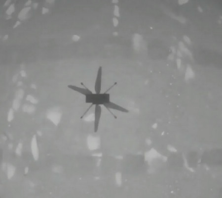 A imagem divulgada mostra o momento em que o helicóptero deixou o solo com destaque para sombra do aparelho sendo registrada pela câmera responsável pela navegação.