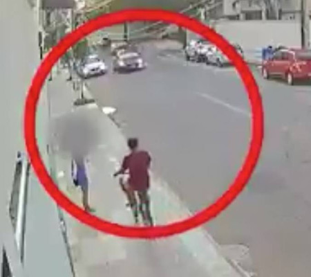 Como é possível ver, ao flagrar o roubo, o namorado da jovem jogou o carro em cima da calçada, atingindo o criminoso que estava de bicicleta. Ele ainda tenta fugir, mas é perseguido e capturado logo em seguida, por agentes da Guarda Municipal.