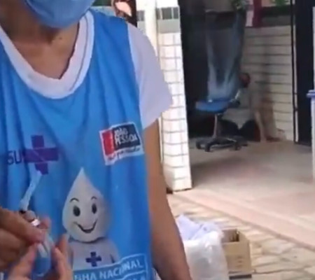 O homem estava com as costas apoiadas no encosto da cadeira, que cedeu da base e ele foi ao chão. Ao mesmo tempo, profissionais da saúde preparavam doses de vacina.