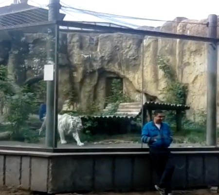 Um vídeo divulgado nas redes mostra o momento em que um tigre-branco tenta atacar um visitante que estava em pé próximo da jaula do felino em um zoológico. As informações são do Sputnik.