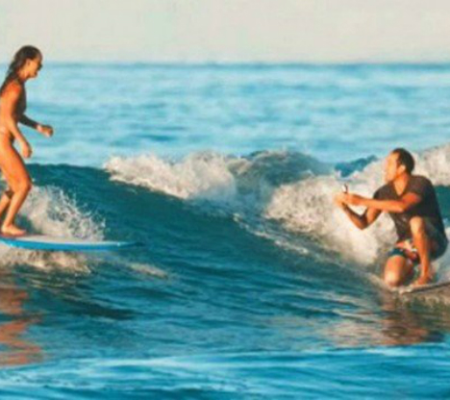 Quando domava uma onda, Christopher Garth, de 38 anos, ajoelhou-se na prancha ao lado da de Lauren Oiye, de 32, tirou uma caixinha com o anel e fez o pedido. Só que o momento romântico acabou mal: Christopher deixou o anel de noivado cair na água. As informações são do Extra.