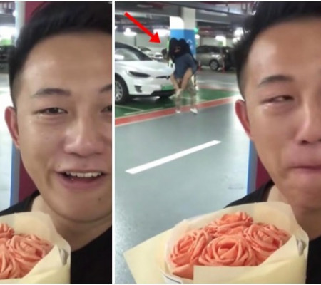 A foto compartilhada na rede social Twitter, trás a seguinte legenda. “Hoje é o aniversário da minha namorada, então pensei em dar-lhe uma surpresa. Eu não esperava ver essa cena”. No começo, você não vê nada de especial sobre as fotos, o que mostra o cara segurando o buquê de flores em um estacionamento, mas dê uma olhada mais de perto.