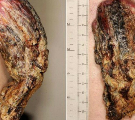 O "chifre" foi removido e o buraco deixado nas costas foi preenchido com pele retirada de uma das coxas do paciente.