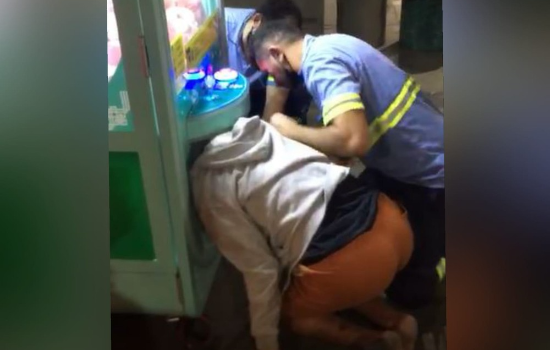 As imagens gravadas no momento do incidente mostram o homem sentado no chão com a cabeça presa em uma extremidade da máquina, por onde saem as pelúcias pegas pelos usuários.