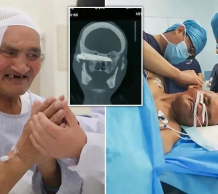 A lâmina foi finalmente retirada no Hospital Shandong Qianfoshan, na China, que descreveu o caso como um " milagre ". As imagens fornecidas pela instalação em Jinan, capital da província de Shandong, mostram a lâmina intacta na parte de trás da cabeça do idoso.