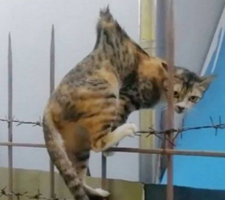 Ao pular entre telhados, a gata ficou espetada em uma barra - em formato de lança afiada - de grade de ferro de uma residência. Os sons de desespero produzidos pelo animal chamaram a atenção de moradores. Eles tentaram ajudar a gata, mas ela respondia tentando mordê-los.
