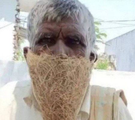 Quando teve que ir ao escritório da Previdência Social para fazer o saque de sua pensão, o morador do vilarejo de Chinnamunugal Chad, em Teleganga, Mekala Kurmayla, inovou ao usar um ninho de pássaro como máscara.