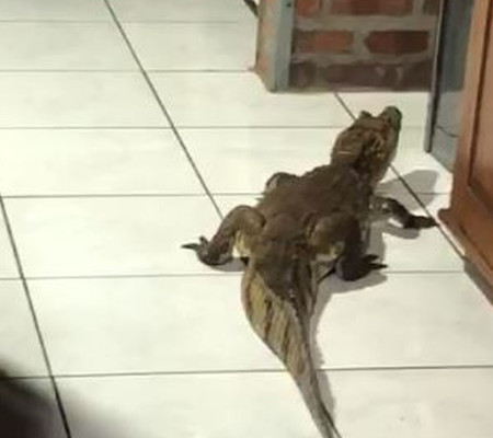 “Eu tinha ido um pouco antes lá na cozinha e não tinha visto nada. Até que meu marido, por volta das 8h da noite, foi lá, viu, e me chamou. Ele [jacaré] estava imóvel, parecia um boneco. No primeiro momento nem fui perto, mas achei que fosse um boneco, uma brincadeira”, relembra.
