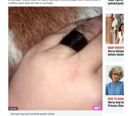 A noiva, feliz em ter recebido o pedido de casamento, compartilhou nas redes sociais o anel de noivado que ganhou. “Meu namorado agora é meu noivo!”, dizia a publicação. Tudo estaria perfeitamente bem, se não fosse o susto que a aliança gerou na internet. “Ele fez o pedido de casamento com um anel feito de uma mecha de seu próprio cabelo”, diz a mulher no texto da rede social.
