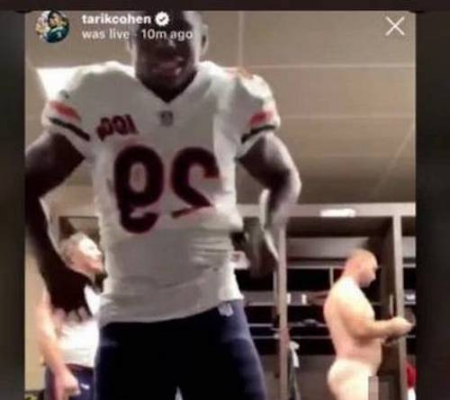 Tarik Cohen, do Bears, decidiu celebrar a vitória com uma live no Instagram direto do vestiário da equipe. Ele posicionou o smartphone no chão e começou a transmissão. Só não se deu conta de que o companheiro de time Kyle Long estava pelado ao fundo.