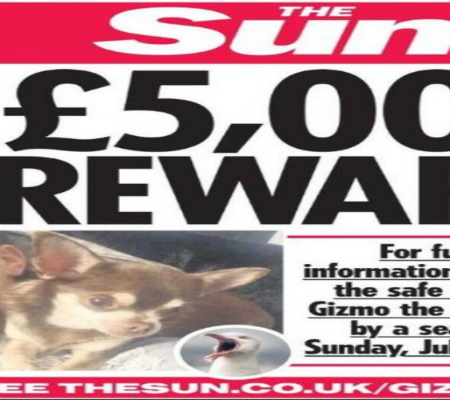 O jornal de londres "The Sun" está oferecendo uma recompensa de nada menos que 5 mil libras (R$ 23,5 mil) por informações que levem ao paradeiro de Gizmo, um chihuahua que, de acordo com a sua dona, Rebecca Hill, de 24 anos, foi levado do jardim da sua casa, em Paignton (Inglaterra), por uma gaivota. As informações são da Extra.