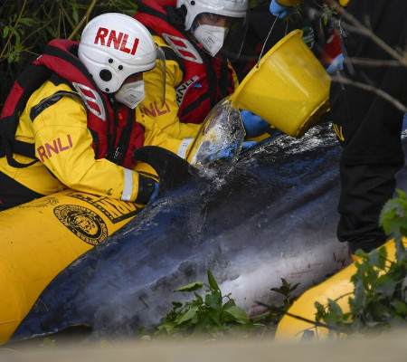 "O estado da baleia se deteriorou nos últimos 45 minutos em que estivemos com ela", disse a coordenadora nacional de resgate da British Divers Marine Life Rescue (BDMLR), Julia Cable, na segunda-feira à noite.