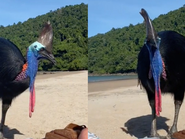O vídeo foi compartilhado há três dias e já conta com 2,9 milhões de visualizações. No registro, um casal de jovens foi visto curtindo um dia de praia quando de repente um pássaro peculiar veio visitá-los. O grande animal, de cor preta e cabeça colorida, não reparou muito nos dois e se dedicou a recolher os restos de comida que estavam na areia.