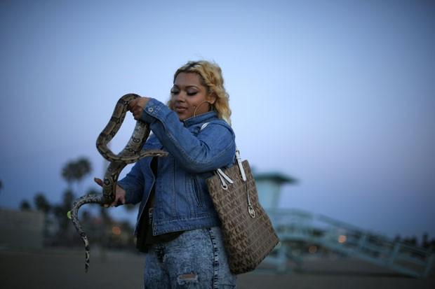 A adolescente Star Alvarez, de 19 anos, chamou atenção enquanto passeava com sua cobra de estimação em uma praia em Venice Beach, na região de Los Angeles, no estado da Califórnia (EUA)