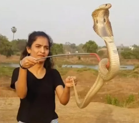 Em um de seus vídeos, que alcançou 1,5 milhão de visualizações, Shweta aparece bem calma segurando o animal com uma vareta para seus 3,9 mil seguidores. A cobra-rei movimenta-se e ameaça picar. Entretanto, a jovem se mantem a certa distância da criatura.
