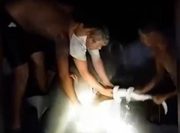 Rapidamente, os jovens mantiveram a cabeça do animal na água e começaram a tirar os filhotes rapidamente, para que voltassem para a água. Em seguida, devolveram a fêmea exausta para o mar.