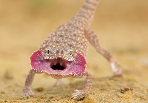 O Phrynocephalus mystaceus, popularmente conhecido como ?lagarto-dragão?, projeta a pele dos cantos da boca deixando sua aparência assustadora para possíveis predadores.