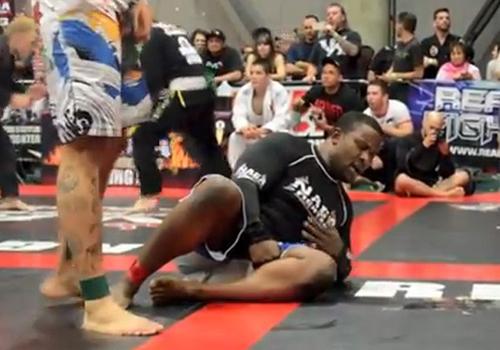 Enquanto trocavam agarrões, um dos lutadores de repente faz cara feia e se dirige ao juiz. ?Ele soltou pum na minha cara?, reclama o homem, enquanto parece desnorteado e se ?recupera? do ?movimento ilegal? feito pelo oponente.