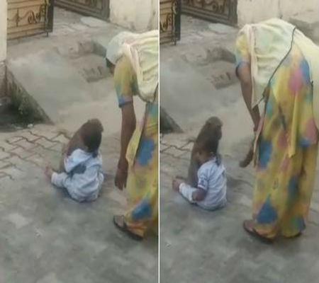 Um macaco "sequestrou" uma criança de uma casa em Haryana (Índia) para ter com quem brincar à beira de uma estrada.