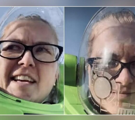 Na falta do acessório, a norte-americana Kelly Hogan usou a criatividade e vestiu um capacete do personagem Buzz Lightyear, do filme Toy Story.