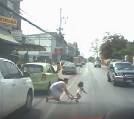 Um motorista dirige tranquilamente pela estrada até que se surpreende com o aparecimento repentino de uma criança e a sua mãe. A mulher tenta agarrar a sua filha pelo braço, mas ambas caem, e o carro é obrigado a parar.