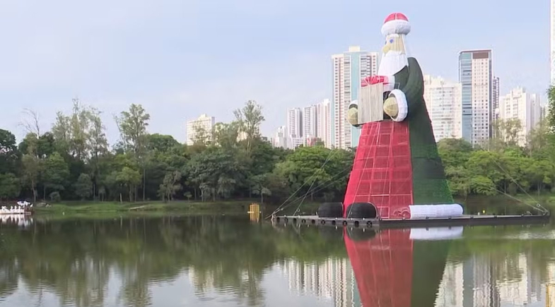 A instalação em formato de Papai Noel, em Londrina (norte do Paraná), foi reconhecida como a maior do mundo pelo Guinness World Records. A medição e a confirmação oficial ocorreram nesta sexta-feira (5). A estrutura impressiona: são 27 metros de altura, 15 toneladas e cerca de 450 mil lâmpadas de LED. O investimento na decoração, instalada no Lago Igapó II, foi de R$ 1.890.000,00, conforme a licitação.